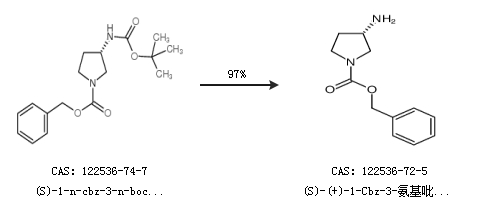 1.通過(guò)(S)-1-n-cbz-3-n-boc-氨基吡咯烷合成(S)-(+)-1-Cbz-3-氨基吡咯烷,收率約97%;