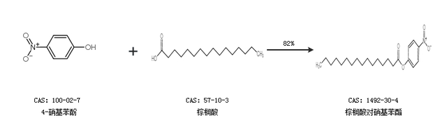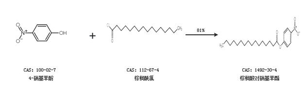 1.通過(guò)4-硝基苯酚和棕櫚酰氯合成棕櫚酸對(duì)硝基苯酯,收率約81%;