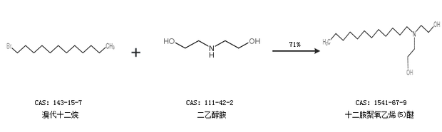 1.通過溴代十二烷和二乙醇胺合成十二胺聚氧乙烯(5)醚,收率約71%;