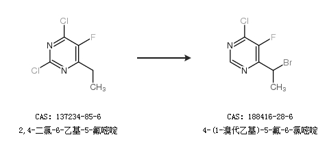 2.通過(guò)2,4-二氯-6-乙基-5-氟嘧啶合成4-(1-溴代乙基)-5-氟-6-氯嘧啶