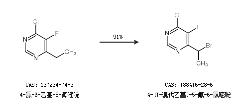 1.通過(guò)4-氯-6-乙基-5-氟嘧啶合成4-(1-溴代乙基)-5-氟-6-氯嘧啶,收率約91%;