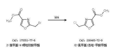 1.通過2-溴甲基-4-噁唑羧酸甲酯合成(2-氯甲基)惡唑-甲酸甲酯,收率約98%;