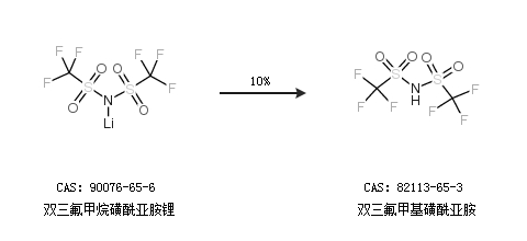 1.通過(guò)雙三氟甲烷磺酰亞胺鋰合成雙三氟甲基磺酰亞胺,收率約10%;