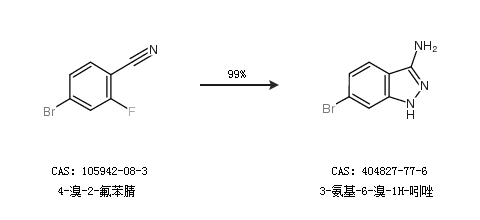 1.通過4-溴-2-氟苯腈合成3-氨基-6-溴-1H-吲唑,收率約99%;