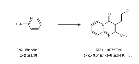 1.通過(guò)2-氨基吡啶和α-乙?;?γ-丁內(nèi)酯合成3-(2-氯乙基)-2-甲基吡啶并[1,2-a]嘧啶-4-酮,收率約51%;