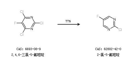 2.通過(guò)2,4,6-三氯-5-氟嘧啶合成2-氯-5-氟嘧啶,收率約77%;