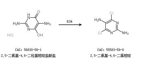 1.通過(guò)2,5-二氨基-4,6-二羥基嘧啶鹽酸鹽合成2,5-二氨基-4,6-二氯嘧啶,收率約63%;