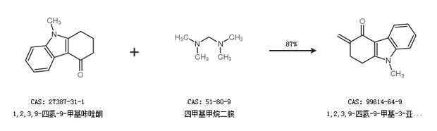 1.通過(guò)1,2,3,9-四氫-9-甲基咔唑酮和四甲基甲烷二胺合成1,2,3,9-四氫-9-甲基-3-亞甲咔唑酮,收率約87%;