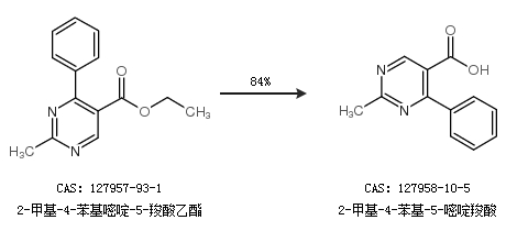 1.通過(guò)2-甲基-4-苯基嘧啶-5-羧酸乙酯合成2-甲基-4-苯基-5-嘧啶羧酸,收率約84%;