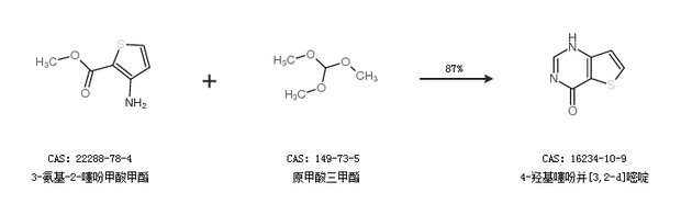 1.通過(guò)3-氨基-2-噻吩甲酸甲酯和原甲酸三甲酯合成4-羥基噻吩并[3,2-d]嘧啶,收率約87%;
