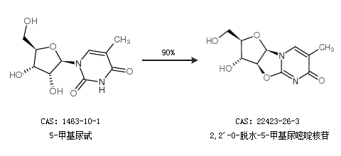 1.通過5-甲基尿甙合成2,2''-O-脫水-5-甲基尿嘧啶核苷,收率約90%;