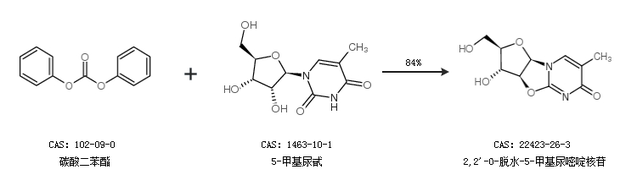2.通過碳酸二苯酯和5-甲基尿甙合成2,2''-O-脫水-5-甲基尿嘧啶核苷,收率約84%;