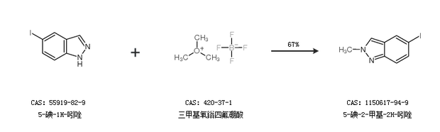 1.通過5-碘-1H-吲唑和三甲基氧鎓四氟硼酸合成5-碘-2-甲基-2H-吲唑,收率約67%;