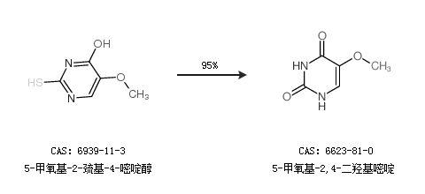 1.通過5-甲氧基-2-巰基-4-嘧啶醇合成5-甲氧基-2,4-二羥基嘧啶,收率約95%;