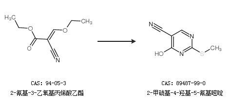 2.通過(guò)2-氰基-3-乙氧基丙烯酸乙酯合成2-甲硫基-4-羥基-5-氰基嘧啶