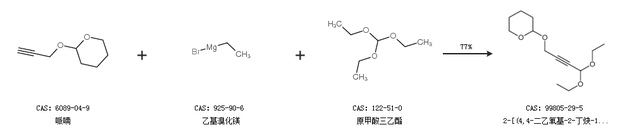1.通過哌喃、乙基溴化鎂和原甲酸三乙酯合成2-[(4,4-二乙氧基-2-丁炔-1-基)氧基]四氫吡喃,收率約77%;
