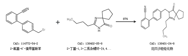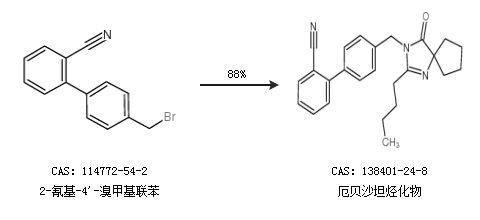 1.通過(guò)2-氰基-4''-溴甲基聯(lián)苯合成厄貝沙坦烴化物,收率約88%;