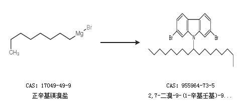 2.通過(guò)正辛基鎂溴鹽合成2,7-二溴-9-(1-辛基壬基)-9H-咔唑
