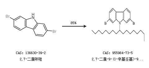1.通過(guò)2,7-二溴咔唑合成2,7-二溴-9-(1-辛基壬基)-9H-咔唑,收率約85%;