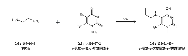 1.通過正丙胺和6-氨基-5-溴-1-甲基尿嘧啶合成6-氨基-5-丙基氨基-1-甲基尿嘧啶,收率約55%;