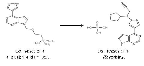 2.通過(guò)4-(1H-吡唑-4-基)-7-((2-(三甲基甲硅烷基)乙氧基)-甲基)-7h-吡咯并[2,3-d]嘧啶合成磷酸魯索替尼