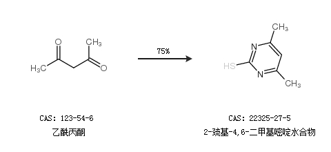 2.通過乙酰丙酮合成2-巰基-4,6-二甲基嘧啶水合物,收率約75%;