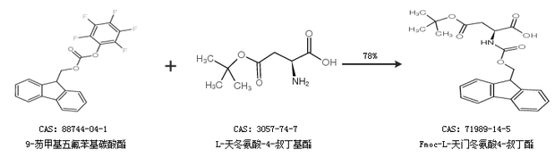 2.通過9-芴甲基五氟苯基碳酸酯和L-天冬氨酸-4-叔丁基酯合成Fmoc-L-天門冬氨酸4-叔丁酯,收率約78%;