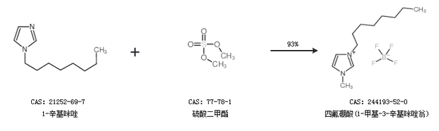 2.通過1-辛基咪唑和硫酸二甲酯合成四氟硼酸(1-甲基-3-辛基咪唑翁),收率約93%;