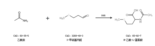 1.通過乙酰胺和3-甲硫基丙醛合成N-乙酰-L-蛋氨酸,收率約85%;