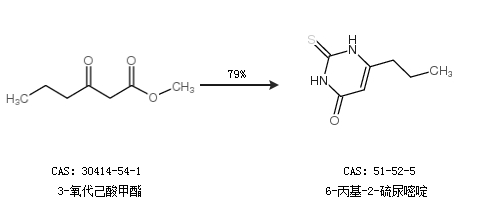 1.通過(guò)3-氧代己酸甲酯合成6-丙基-2-硫尿嘧啶,收率約79%;