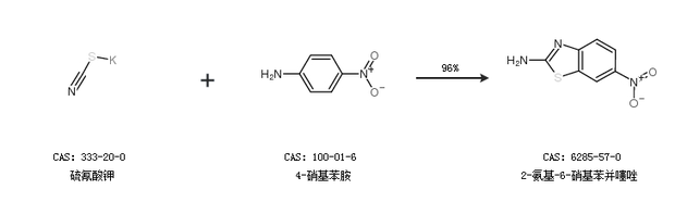 1.通過(guò)硫氰酸鉀和4-硝基苯胺合成2-氨基-6-硝基苯并噻唑,收率約96%;