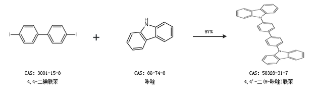 1.通過(guò)4,4-二碘聯(lián)苯和咔唑合成4,4''-二(9-咔唑)聯(lián)苯,收率約97%;