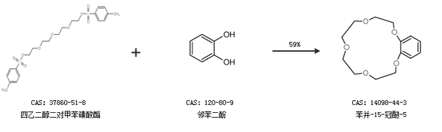 2.通過(guò)四乙二醇二對(duì)甲苯磺酸酯和鄰苯二酚合成苯并-15-冠醚-5,收率約59%;