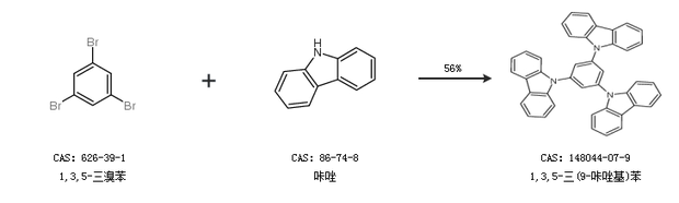 2.通過1,3,5-三溴苯和咔唑合成1,3,5-三(9-咔唑基)苯,收率約56%;