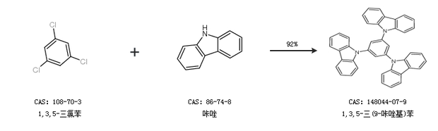 1.通過1,3,5-三氯苯和咔唑合成1,3,5-三(9-咔唑基)苯,收率約92%;