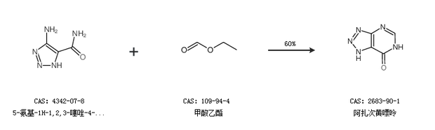 1.通過(guò)5-氨基-1H-1,2,3-噻唑-4-羧酰胺和甲酸乙酯合成阿扎次黃嘌呤,收率約60%;
