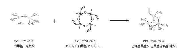 2.通過六甲基二硅氧烷和2,4,6,8-四甲基-2,4,6,8-四乙烯基環(huán)四硅氧烷合成乙烯基甲基雙(三甲基硅氧基)硅烷
