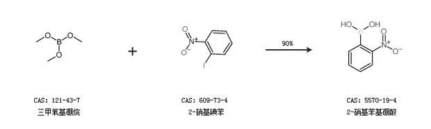 1.通過(guò)三甲氧基硼烷和2-硝基碘苯合成2-硝基苯基硼酸,收率約90%;