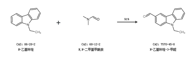 1.通過N-乙基咔唑和N,N-二甲基甲酰胺合成N-乙基咔唑-3-甲醛,收率約91%;