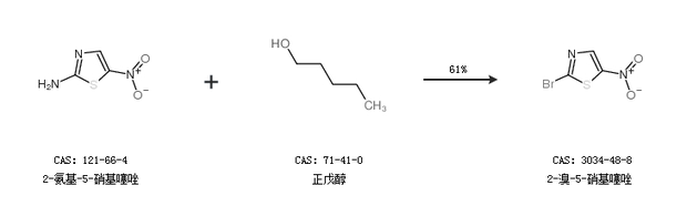 2.通過(guò)2-氨基-5-硝基噻唑和正戊醇合成2-溴-5-硝基噻唑,收率約61%;