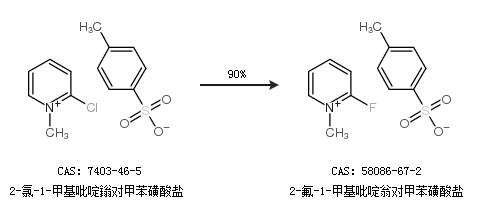 2.通過2-氯-1-甲基吡啶鎓對(duì)甲苯磺酸鹽合成2-氟-1-甲基吡啶翁對(duì)甲苯磺酸鹽,收率約90%;