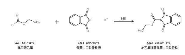 1.通過氯甲酸乙酯和鄰苯二甲酰亞胺鉀合成N-乙氧羰基鄰苯二甲酰亞胺,收率約98%;