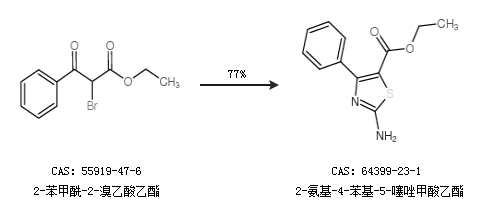 2.通過2-苯甲酰-2-溴乙酸乙酯合成2-氨基-4-苯基-5-噻唑甲酸乙酯,收率約77%;