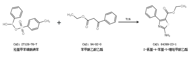 1.通過羥基甲苯磺酰碘苯和苯甲酰乙酸乙酯合成2-氨基-4-苯基-5-噻唑甲酸乙酯,收率約71%;