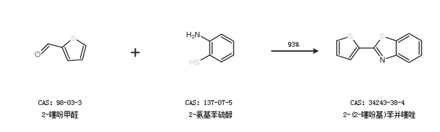 1.通過2-噻吩甲醛和2-氨基苯硫醇合成2-(2-噻吩基)苯并噻唑,收率約93%;