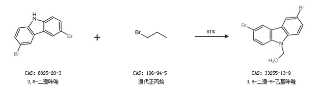 1.通過(guò)3,6-二溴咔唑和溴代正丙烷合成3,6-二溴-9-乙基咔唑,收率約81%;
