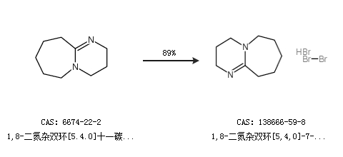 1.通過1,8-二氮雜雙環(huán)[5.4.0]十一碳-7-烯合成1,8-二氮雜雙環(huán)[5,4,0]-7-十一碳烯氫三溴化物,收率約89%;