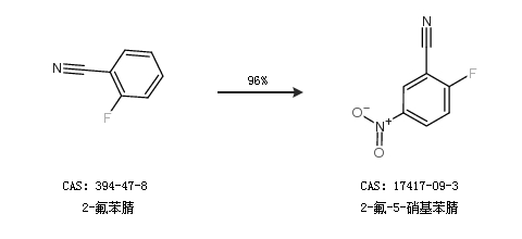 2.通過2-氟苯腈合成2-氟-5-硝基苯腈,收率約96%;
