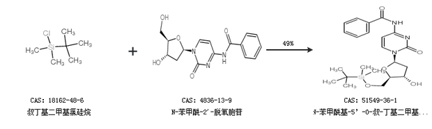 2.通過叔丁基二甲基氯硅烷和N-苯甲酰-2''-脫氧胞苷合成N-苯甲酰基-5’-O-叔-丁基二甲基甲硅烷-2’-脫氧胞啶,收率約49%;