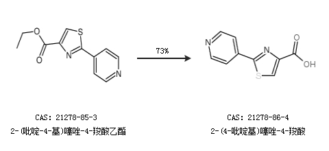 1.通過(guò)2-(吡啶-4-基)噻唑-4-羧酸乙酯合成2-(4-吡啶基)噻唑-4-羧酸,收率約73%;